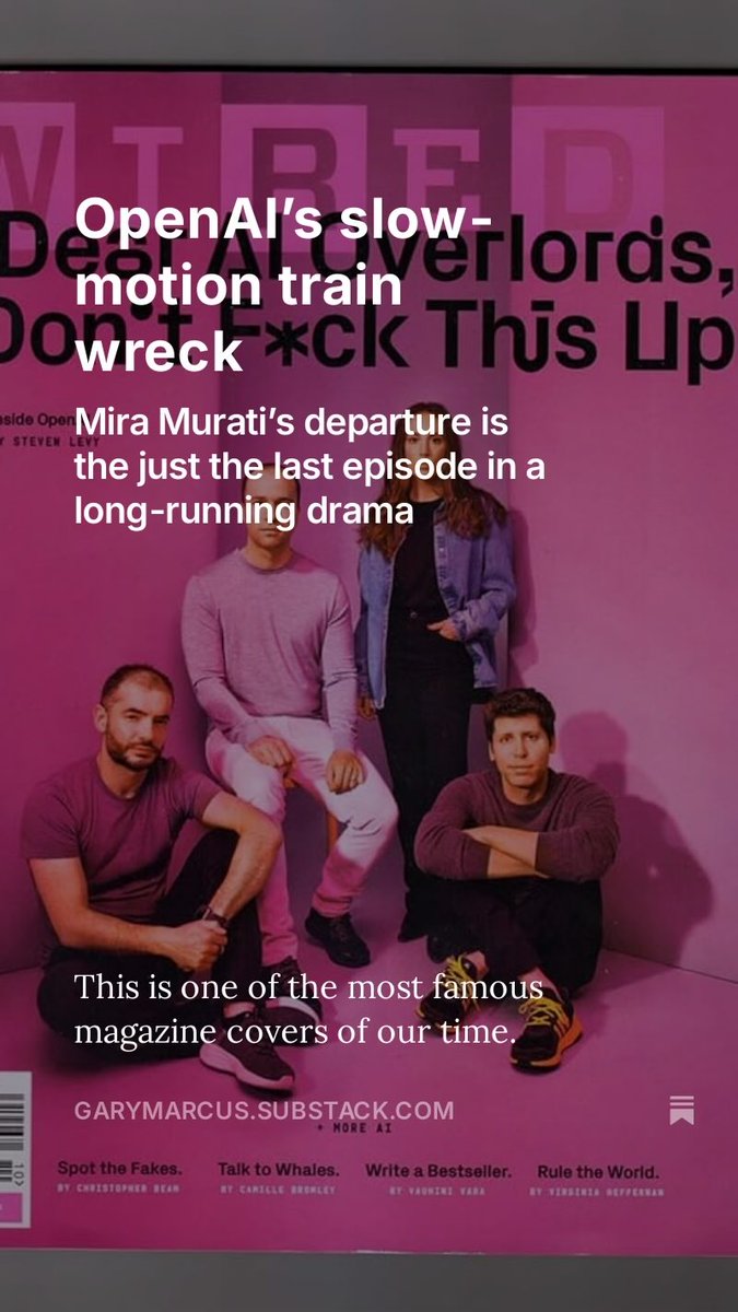 The statement and accompanying image discuss the departure of Mira Murati from OpenAI, framing it as part of a larger, ongoing issue within the organization. The tone is critical and somewhat sensational, referring to the situation as a 'slow-motion train wreck' and a 'long-running drama.' This suggests a negative view of the internal dynamics at OpenAI.