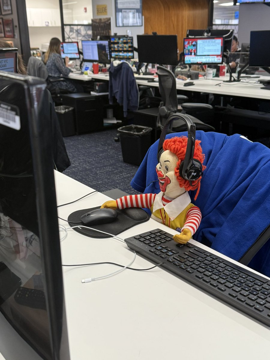 The image depicts a humorous scene of a Ronald McDonald doll sitting at a computer workstation, wearing headphones and appearing to work. The tone is lighthearted and intended to amuse viewers. It does not engage with public issues, debates, or discussions that contribute to civic dialogue.