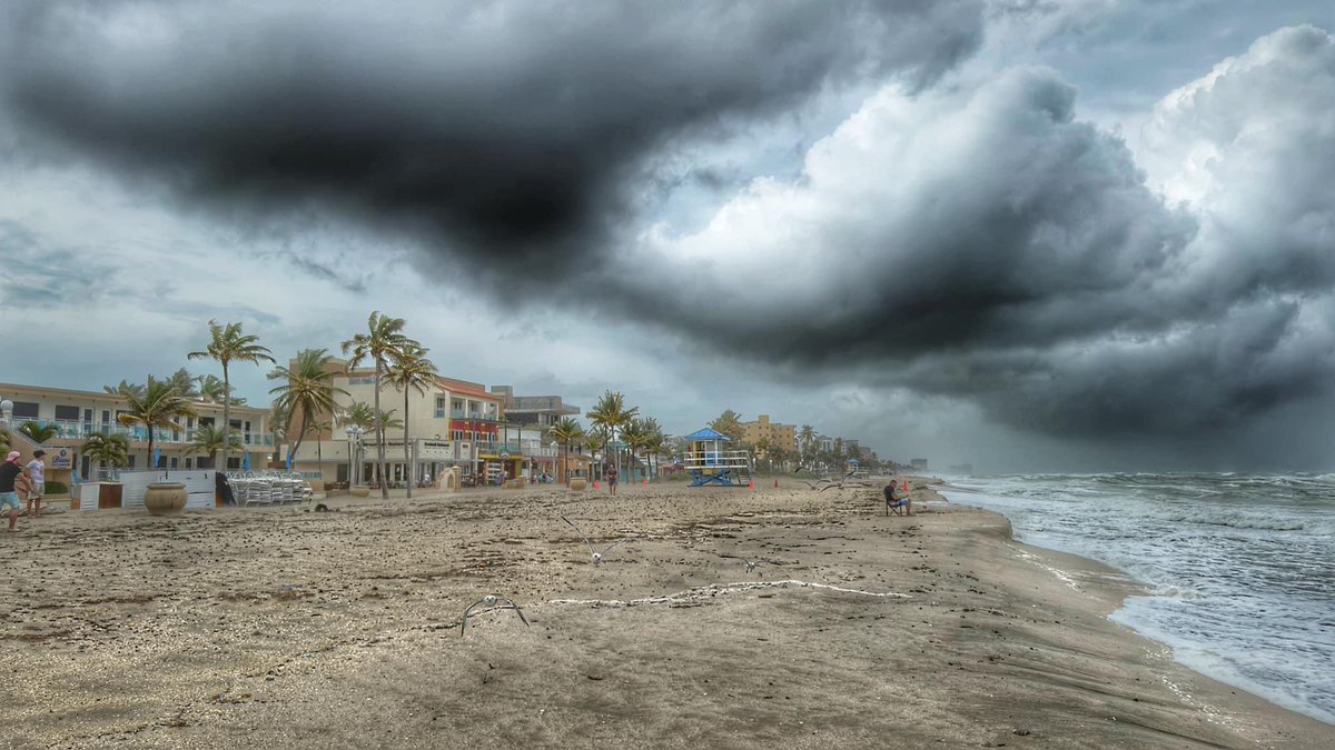 The statement 'South Florida tonight.' accompanied by the image of a beach with dark, stormy clouds does not constitute public discourse. It appears to be a simple observational or descriptive statement about the weather in South Florida, likely intended to inform or update viewers about current conditions.