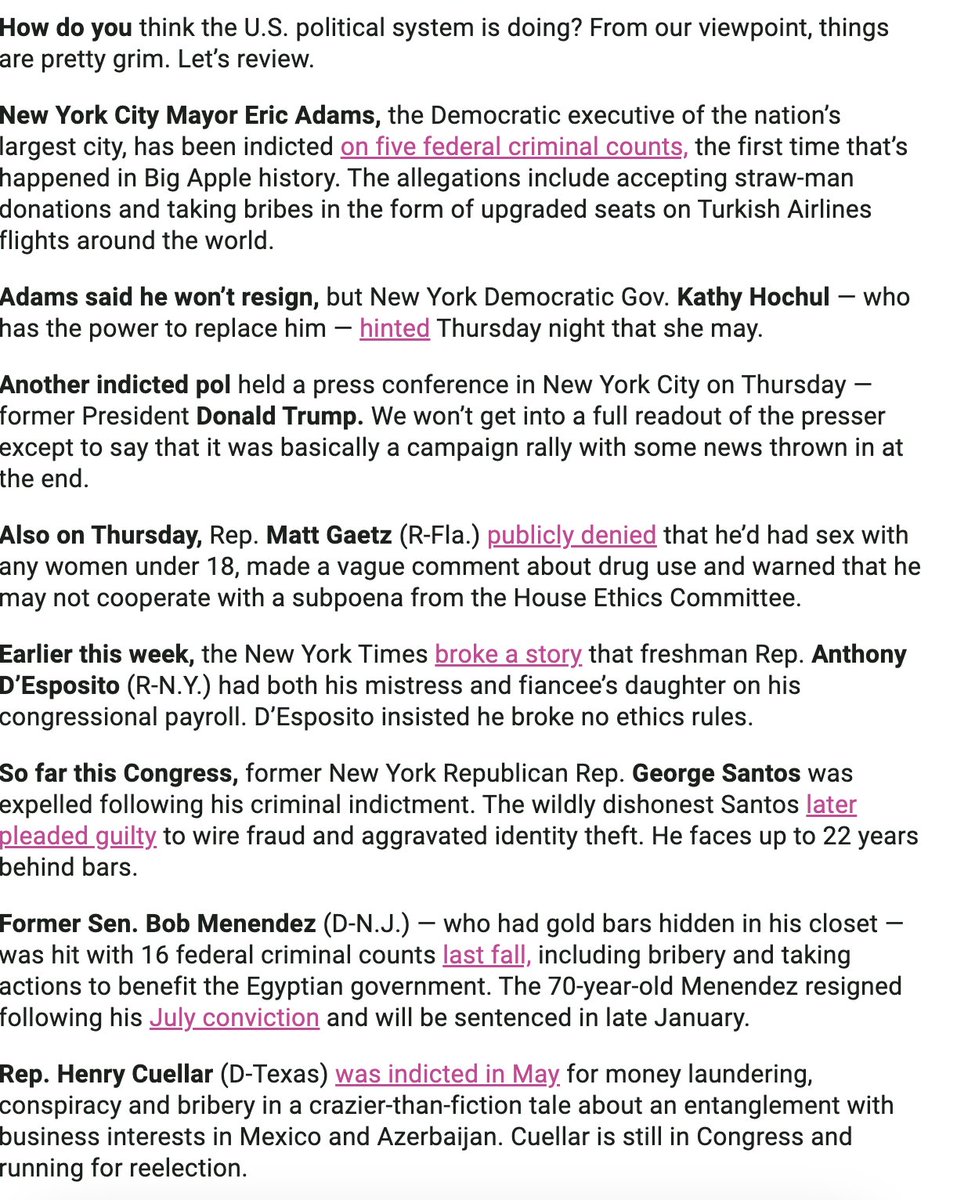 The statement and accompanying images provide a critical overview of various scandals, indictments, and ethical issues involving U.S. political figures. The tone is critical and somewhat sensational, aiming to highlight the perceived dysfunction and corruption within the political system. The intent appears to be to inform the public about these issues and provoke thought or discussion about the state of U.S. politics.