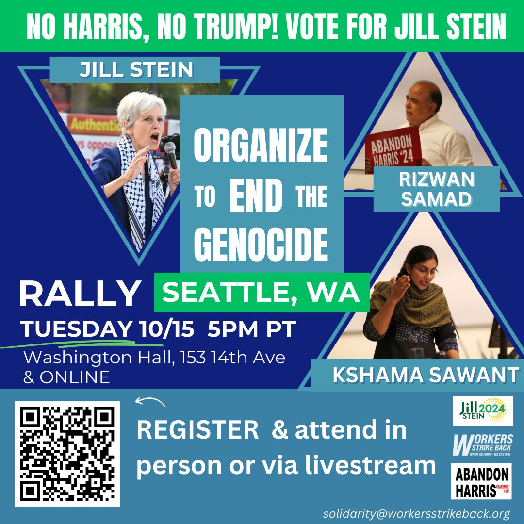 The statement and accompanying image promote a political rally featuring Jill Stein and Kshama Sawant, focusing on anti-war and pro-worker themes. It criticizes corporate candidates and calls for organizing against perceived genocide.
