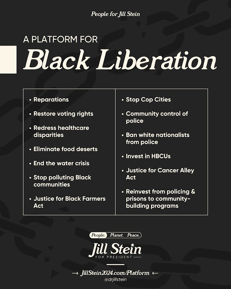 The statement and image present a political platform focused on Black liberation, addressing systemic issues such as reparations, voting rights, healthcare disparities, and community control of police. The tone is collaborative and appreciative, emphasizing the involvement of the Black community.