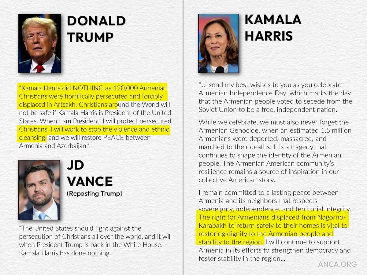 The statement critiques the campaign records of Kamala Harris and Donald Trump regarding their positions on Azerbaijani aggression and Armenian issues. It calls for accountability and action before Election Day, emphasizing the importance of Armenian votes.
