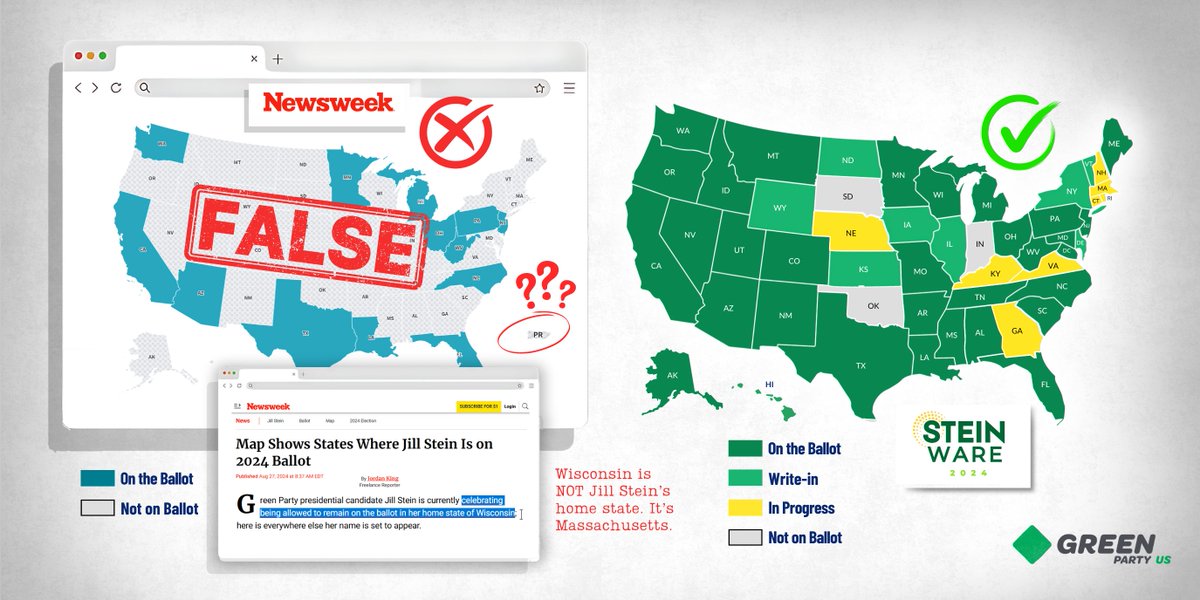The statement addresses a public issue regarding the accuracy of media reporting on political candidates' ballot access. It critiques Newsweek for allegedly misrepresenting the Green Party's ballot access, which is a substantive engagement with public discourse.