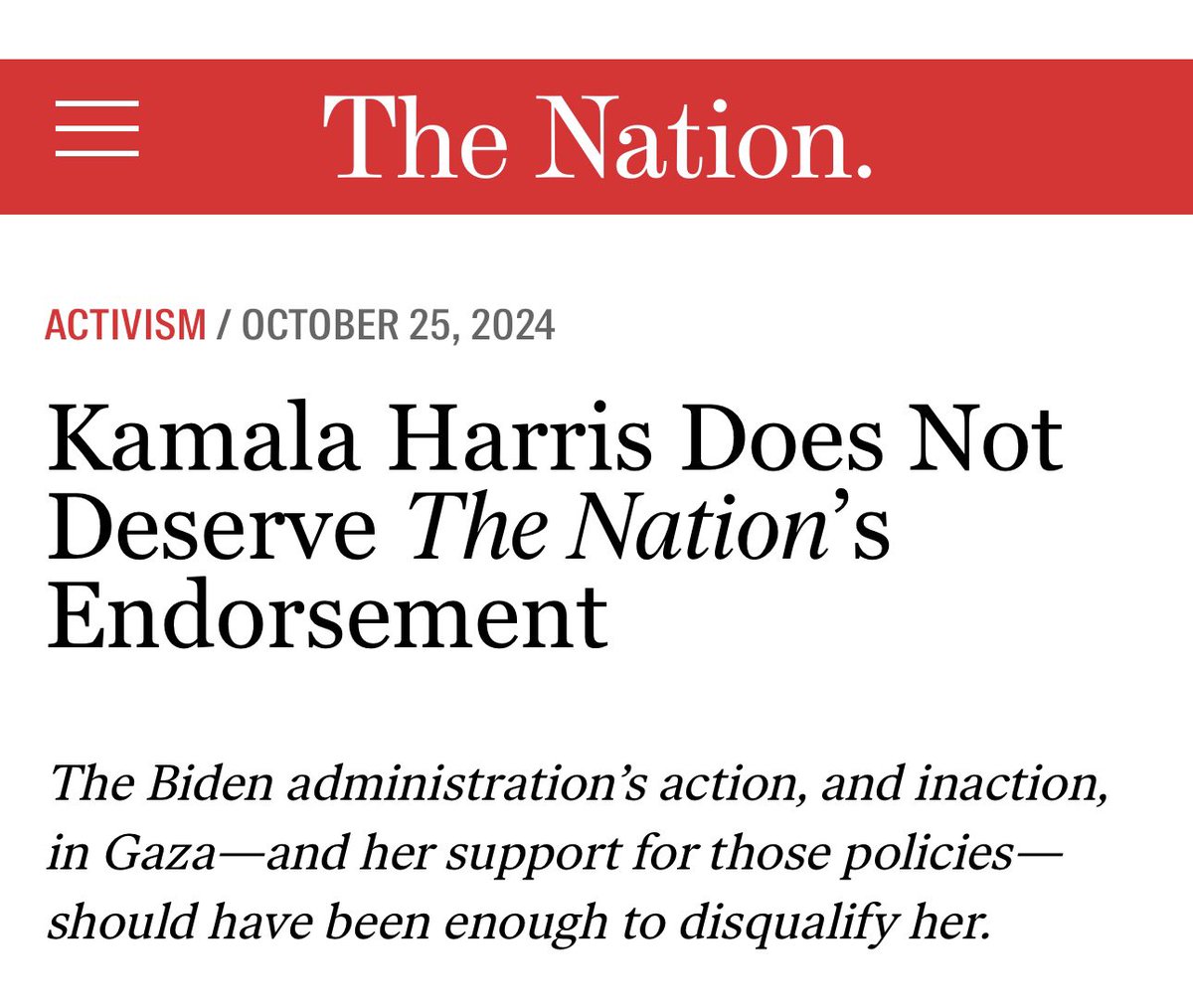 The statement criticizes Kamala Harris for her support of certain policies and expresses disappointment in The Nation for not endorsing an alternative candidate. It addresses public issues such as foreign policy, climate justice, and economic reform.