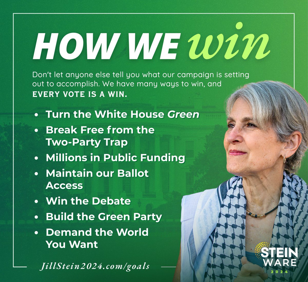 The statement and accompanying content promote a political campaign, emphasizing the value of each vote for Jill Stein as a step towards achieving broader political goals. It encourages participation in the democratic process and supports the growth of the Green Party.