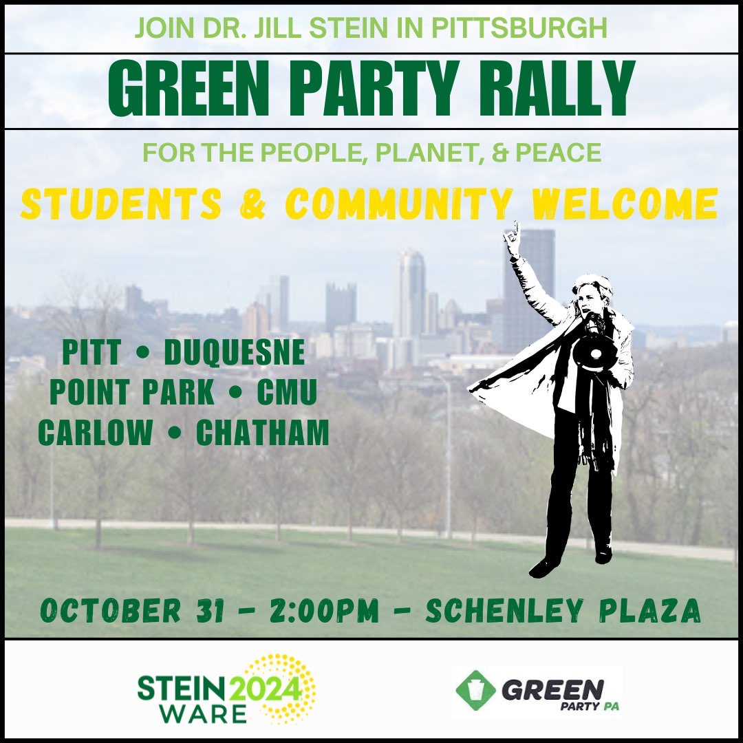 The statement is a promotional announcement for a Green Party rally led by Dr. Jill Stein, inviting students and community members interested in social justice. It does not engage in substantive public discourse on societal issues or policies.
