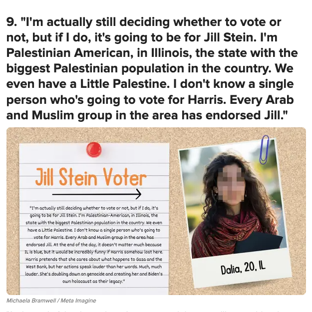 The statement and images discuss voter preferences and motivations, focusing on support for Jill Stein among certain groups. It highlights political issues such as foreign policy, economic reforms, and social justice, contributing to public discourse.