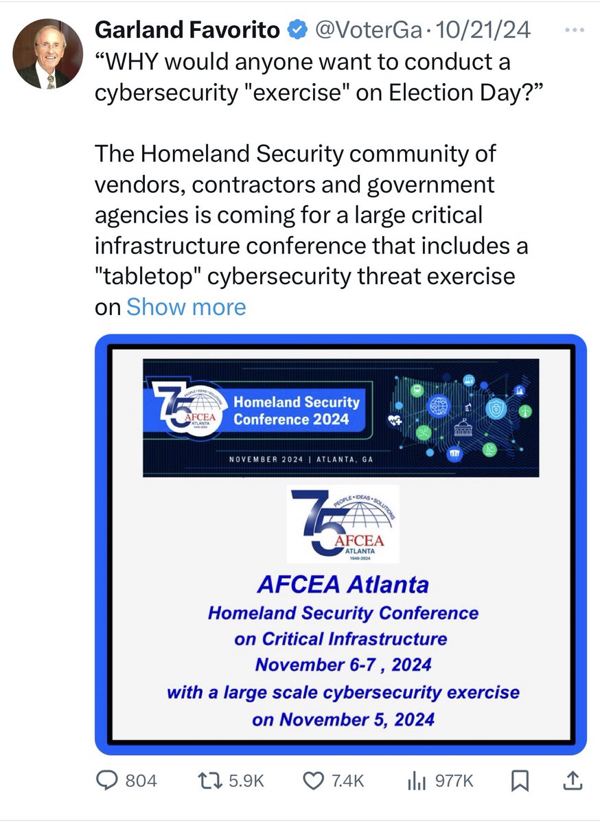 The statement questions the timing and transparency of a cybersecurity exercise planned for Election Day, suggesting potential issues with the involvement of Homeland Security. It raises concerns about the appropriateness and implications of such an event on a significant day.