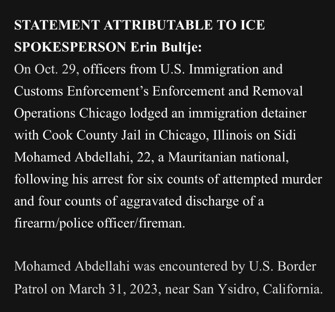 The statement reports on a serious incident involving a suspect's immigration status, potentially influencing public opinion on immigration policies. It highlights the suspect's nationality and immigration status, which could contribute to stigmatization.