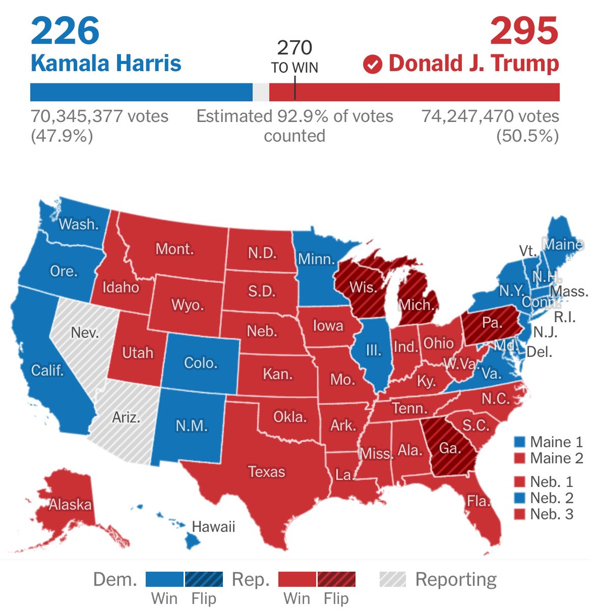 The statement provides information about vote counts in an election, suggesting a significant increase in votes for Donald Trump compared to previous elections. The accompanying image shows a map with electoral votes, indicating a lead for Trump over Kamala Harris. The statement and image together imply a discussion about election results, which is a public issue.