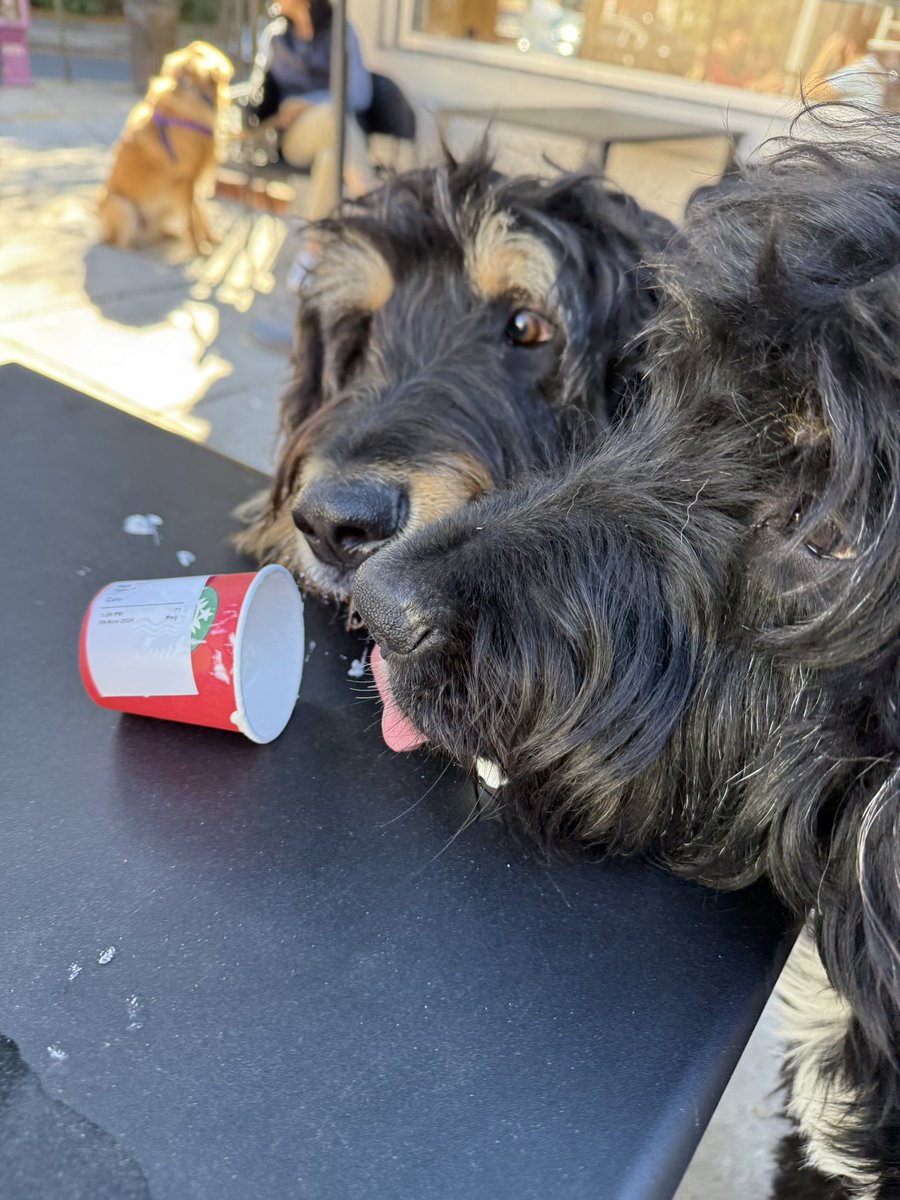 The statement 'Puppiccino' accompanied by images of dogs enjoying a treat is lighthearted and playful. It does not engage with public issues or contribute to civic dialogue, thus it does not constitute public discourse.