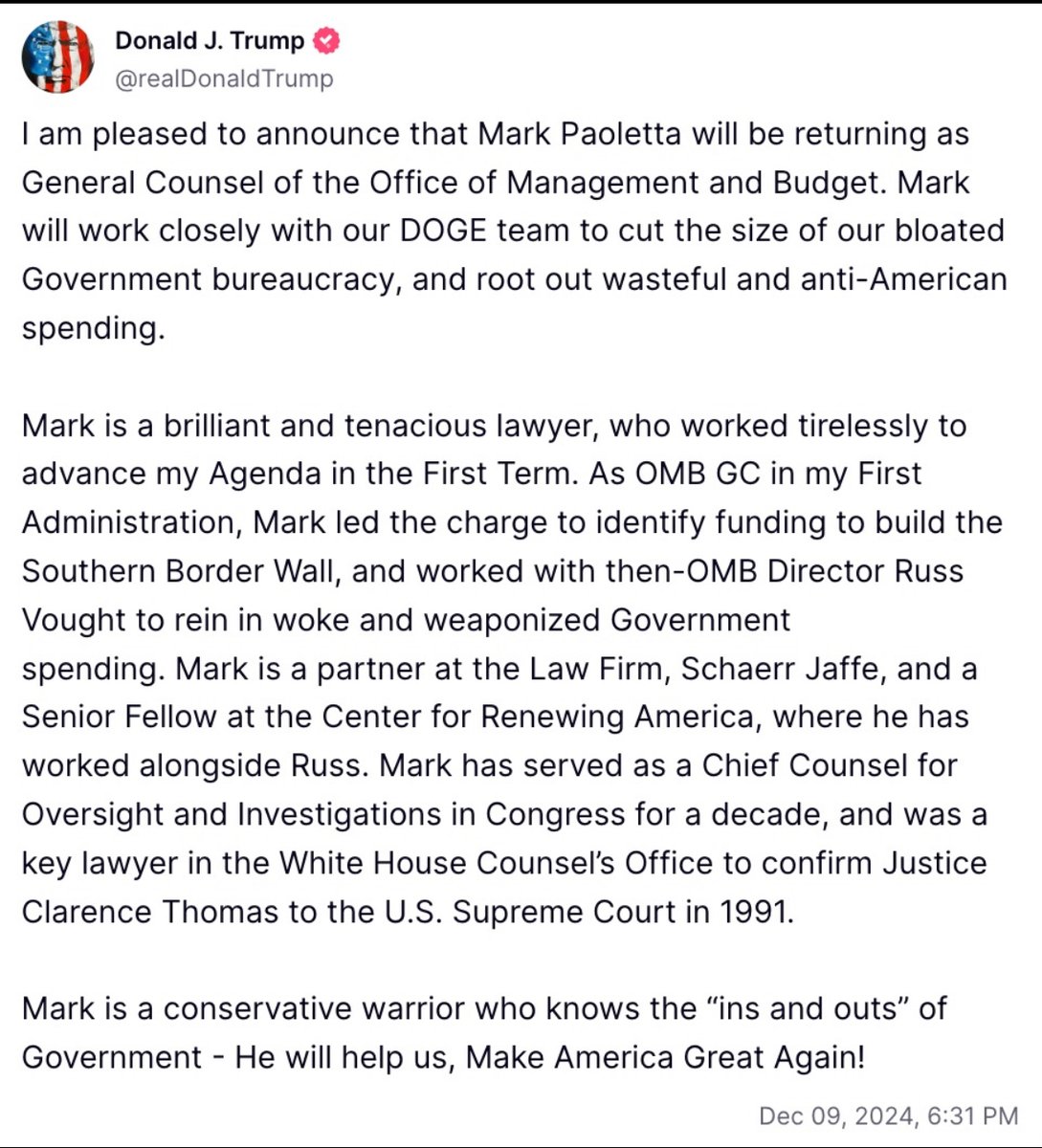 The statement and accompanying image discuss a political appointment and agenda, which constitutes public discourse. The tone is congratulatory and supportive, focusing on government efficiency and policy implementation.