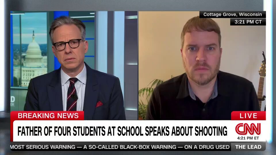 The statement references a serious public issue, namely a school shooting, and directs readers to a video detailing a father's account of his children's experience during the event. This constitutes public discourse as it engages with the societal issue of gun violence and its impact on families.