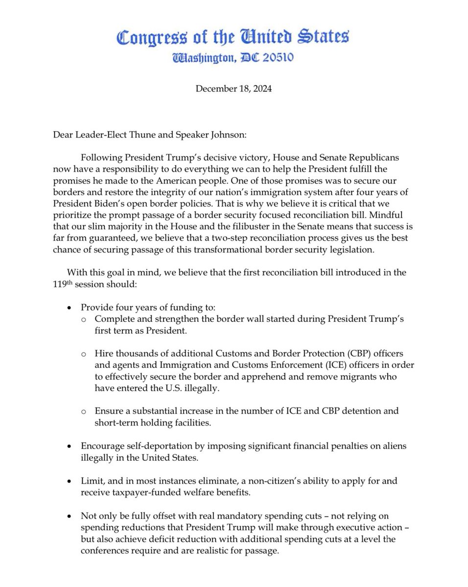 The statement and accompanying images discuss political strategies and legislative priorities, focusing on border security, economic policies, and spending cuts. It reflects a partisan perspective, advocating for specific policy actions aligned with former President Trump's agenda.