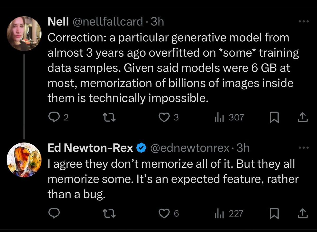 The statement engages in a technical discussion about the capabilities of generative AI systems, specifically addressing whether these systems memorize data. The tone is somewhat sarcastic, questioning the assertion that generative models are not truly generative. This contributes to the broader debate on AI capabilities and limitations.