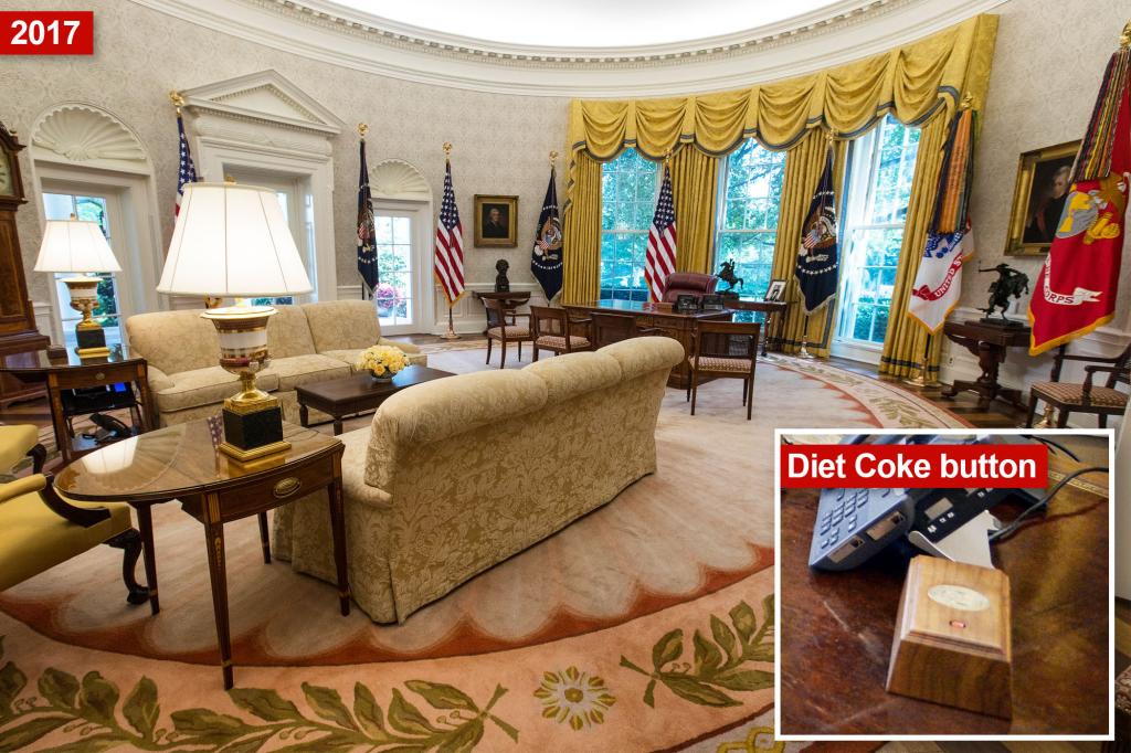 The statement is lighthearted and focuses on a trivial aspect of the presidency, specifically the return of a Diet Coke button in the Oval Office. It does not engage with substantive public issues or contribute to civic dialogue.