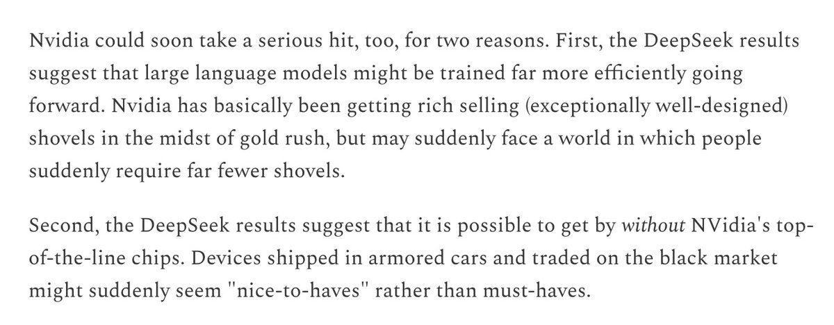 The statement and images discuss the potential impact of DeepSeek on Nvidia and the market, comparing it to the dotcom bust. It critiques Nvidia's market position and suggests a shift in technology needs. The tone is analytical but includes a personal jab at Gary Marcus, which detracts from constructive discourse.