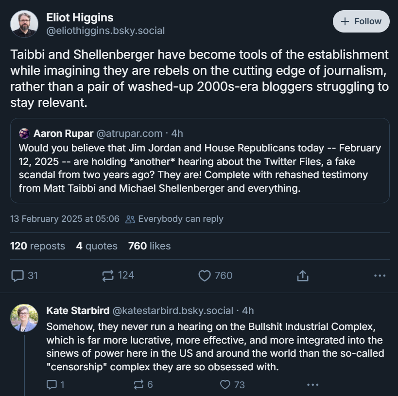 The statement uses a sarcastic tone to criticize Eliot Higgins, implying hypocrisy in his actions. It references a broader conversation about media figures and their roles in public discourse, particularly regarding controversial topics like the 'Twitter Files' and alleged collaborations with questionable figures.