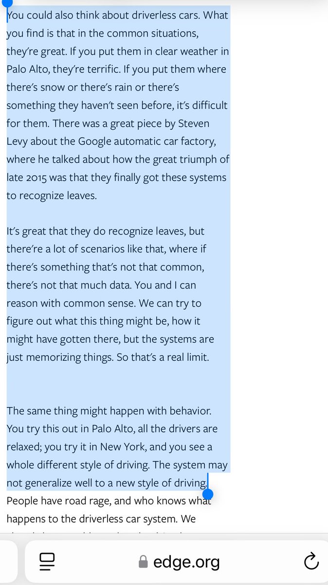 The statement discusses the challenges of perfecting driverless cars, highlighting the limitations of AI in handling uncommon scenarios. It critiques the reliance on memorization rather than understanding, using a real-world example to illustrate the point.
