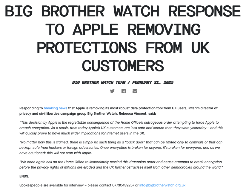 The statement from Big Brother Watch criticizes the UK Home Office's order to Apple, framing it as an attack on privacy and encryption. It argues that this decision compromises the safety of UK users and calls for the order to be rescinded.