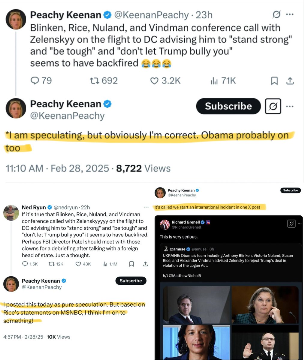 The statement and accompanying images involve the spread of a conspiracy theory about Susan Rice and others allegedly advising President Zelenskyy. The tone is speculative and accusatory, with claims of illegal activity without evidence. This can contribute to misinformation and public misunderstanding.