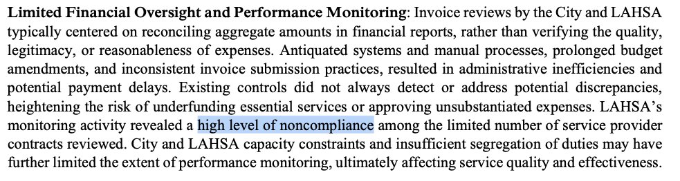 The statement is a critical commentary on the alleged mismanagement and corruption in Los Angeles' homelessness spending. It accuses officials of breaking the law and misusing public funds, linking these actions to the harm of homeless individuals. The tone is accusatory and aims to hold public officials accountable.
