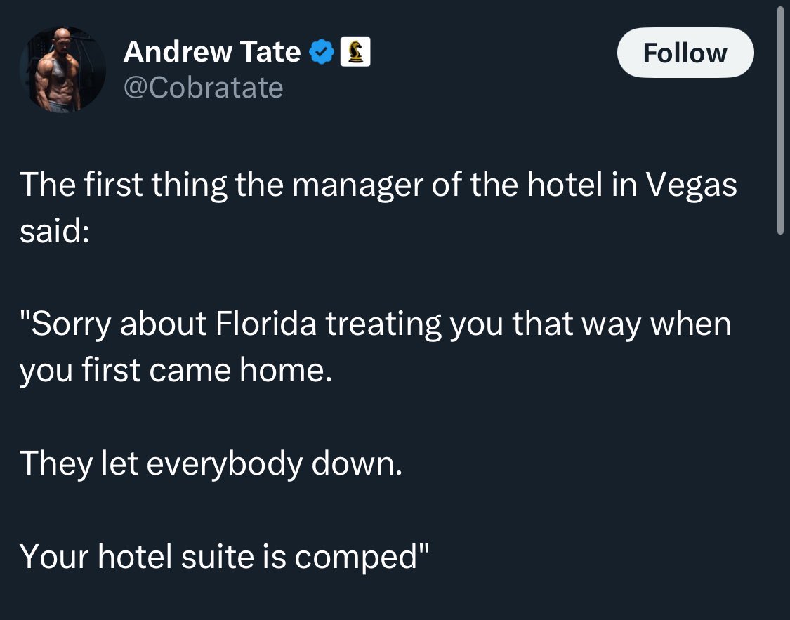 The statement is a lighthearted commentary on a scene from the movie 'Casino,' focusing on the irony of casinos comping skilled gamblers. The accompanying image is a quote about a hotel comping a suite, which adds a humorous touch. The tone is casual and not intended to engage in public discourse.