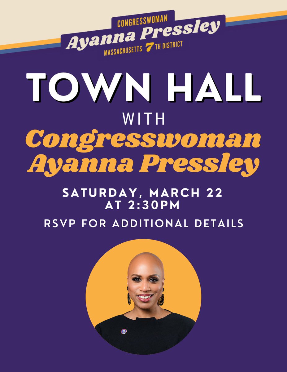 The statement constitutes public discourse as it invites participation in a town hall to discuss political issues involving public figures and policies. It aims to engage the public in civic dialogue.