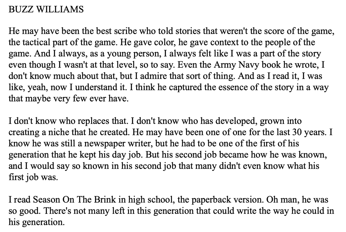 The statement and accompanying images are tributes to John Feinstein, highlighting his impact as a sportswriter and his personal qualities. The tone is respectful and appreciative, focusing on his storytelling ability, integrity, and personal relationships.