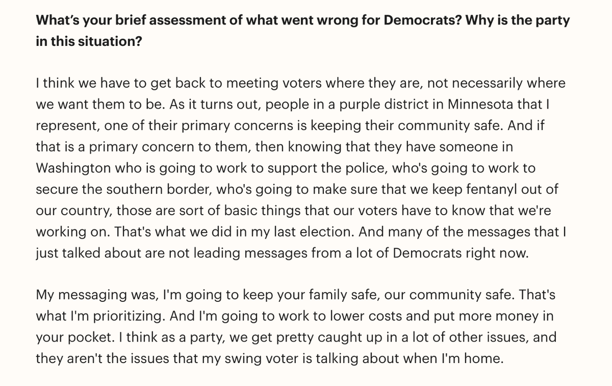 The statement and accompanying images discuss political strategy and messaging within the Democratic Party, focusing on connecting with voters' concerns and critiquing current approaches. The tone is constructive, aiming to provide insight into successful political communication.