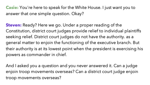The statement involves a discussion on constitutional authority and the role of district court judges, touching on public issues related to governance and legal interpretation. The tone is confrontational, with accusations of constitutional violations and political bias.
