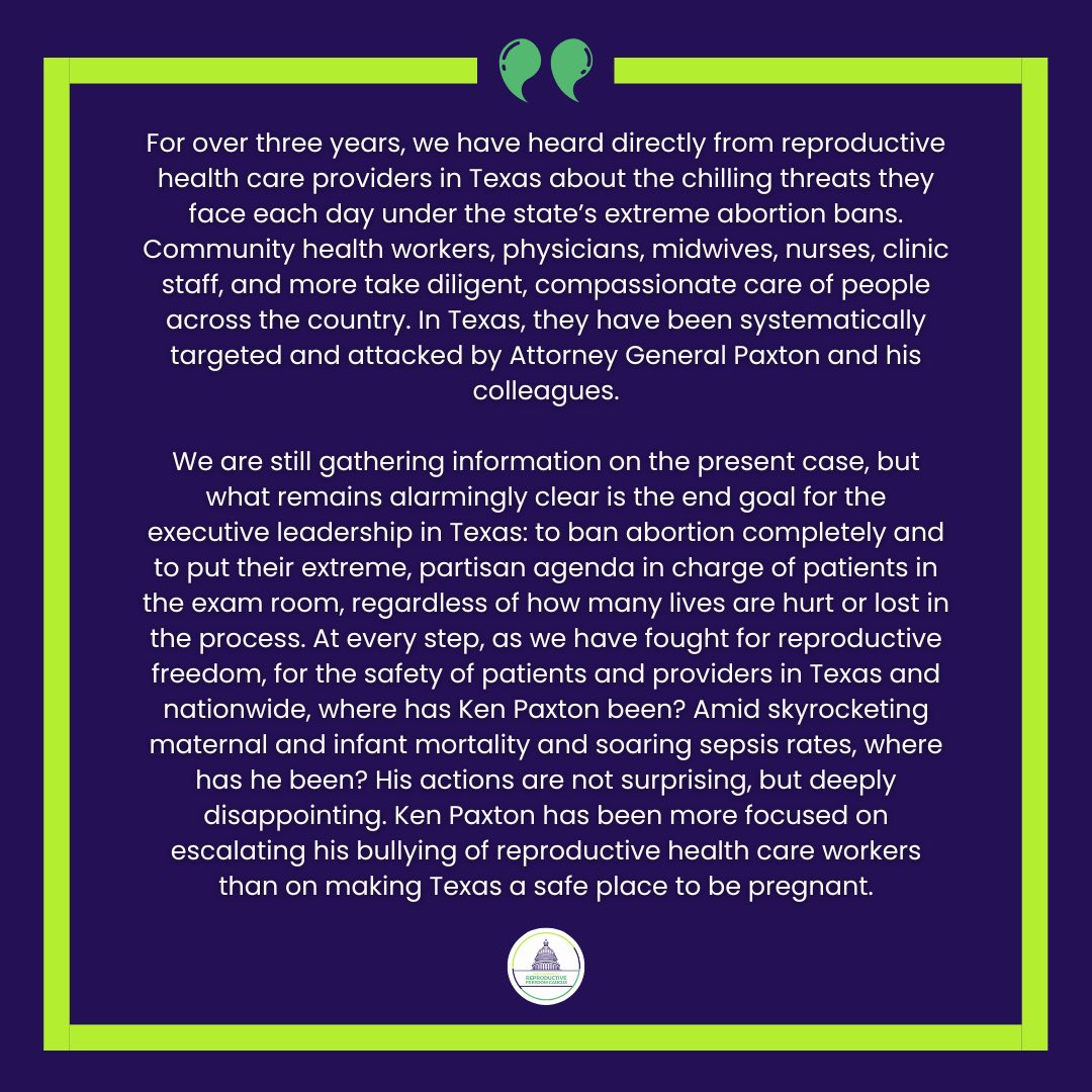 The statement criticizes Ken Paxton's approach to abortion laws in Texas, highlighting concerns about the impact on reproductive health care providers and patients. It uses strong language to convey disagreement with Paxton's policies, suggesting they are extreme and harmful.