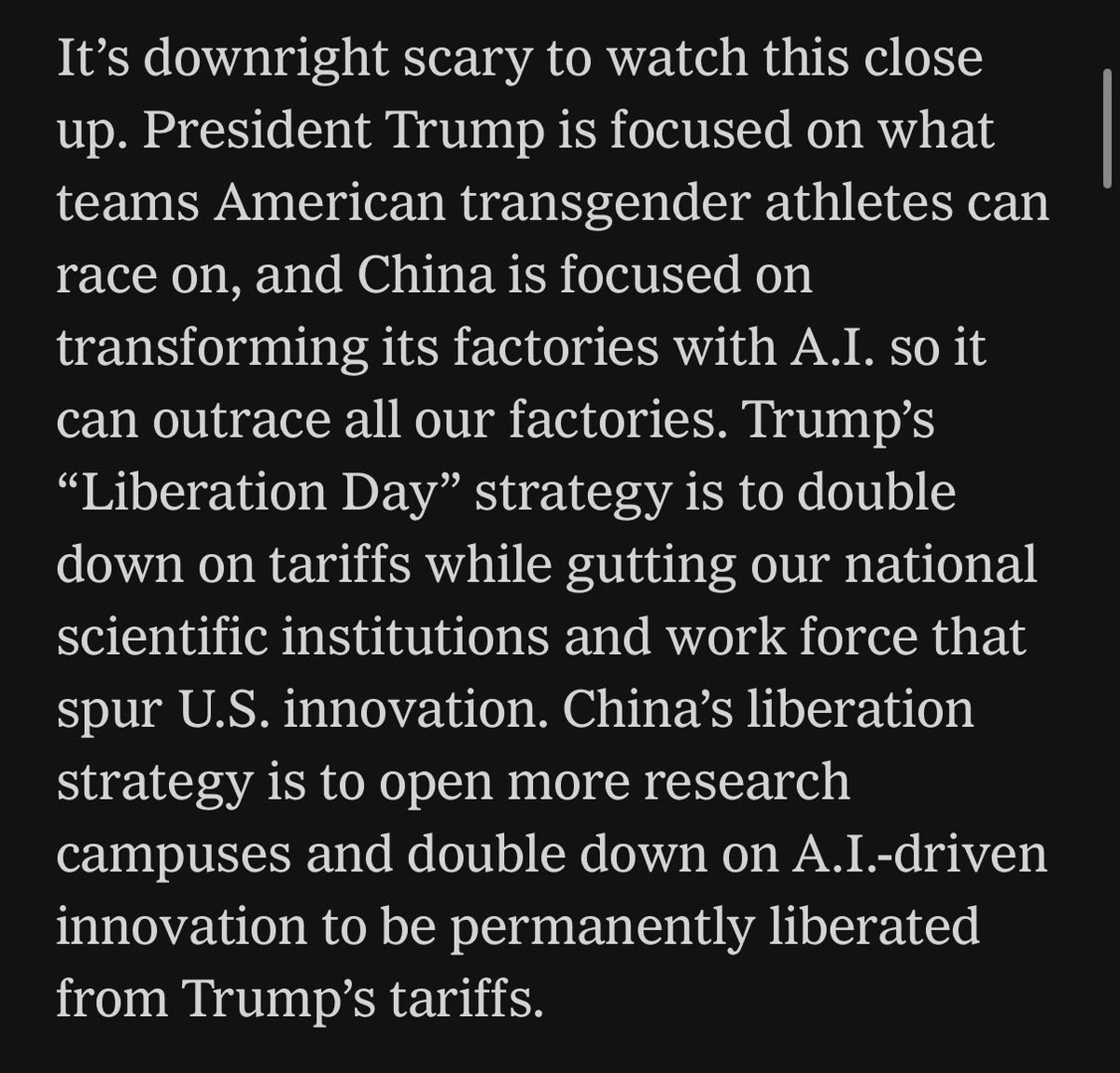 The statement critiques former President Trump's policies, contrasting them with China's strategic focus on AI and innovation. It suggests that Trump's focus on tariffs and social issues may hinder U.S. innovation, while China advances technologically. The tone is critical and suggests a strategic disadvantage for the U.S.