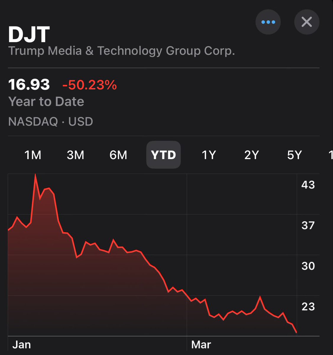 The statement uses emojis to mock the decline in stock value of Trump Media & Technology Group Corp. It conveys a tone of ridicule or schadenfreude.