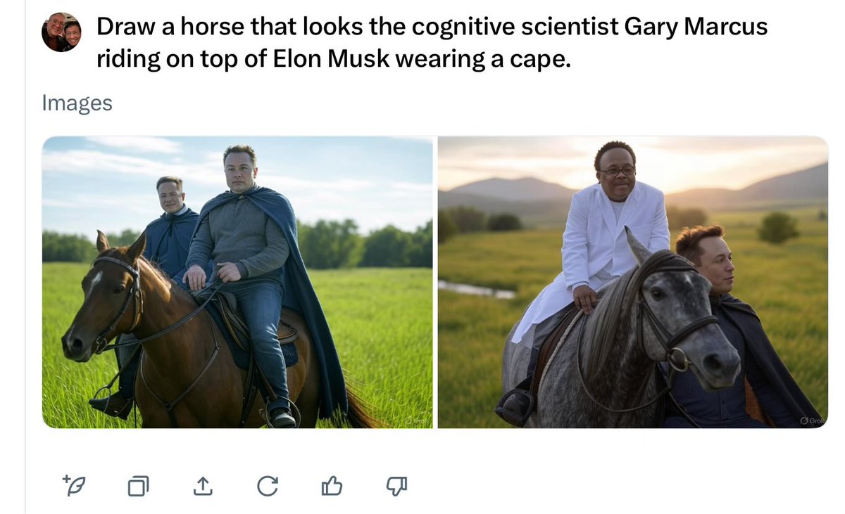 The statement and images are part of a humorous and lighthearted conversation about AI-generated images. The tone is playful, focusing on the creative and sometimes absurd outputs of image generation models. It does not engage in substantive public discourse or address societal issues.