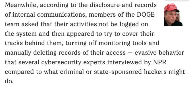 The statement raises concerns about DOGE's alleged actions, comparing them to criminal or state-sponsored hacking. It questions the transparency and security practices of DOGE, suggesting unethical behavior. The tone is accusatory and implies wrongdoing without providing concrete evidence.