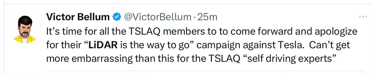 The statement engages in a public discourse about the use of LiDAR technology in Tesla vehicles, addressing a debate between Tesla supporters and critics. It uses a sarcastic tone to criticize TSLAQ members for their stance on LiDAR.