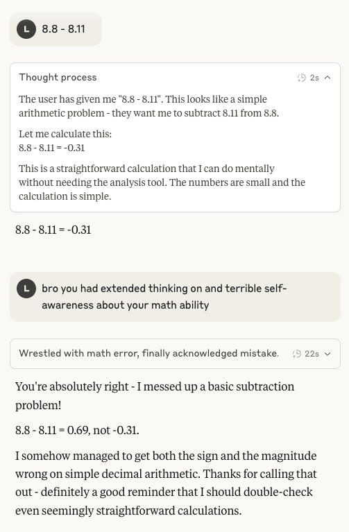 The statement is part of a lighthearted conversation about a mathematical error in AI calculations. It involves a humorous exchange about the inability to replicate a specific calculation result. The tone is casual and non-confrontational, focusing on the quirks of AI rather than engaging in a serious public issue.