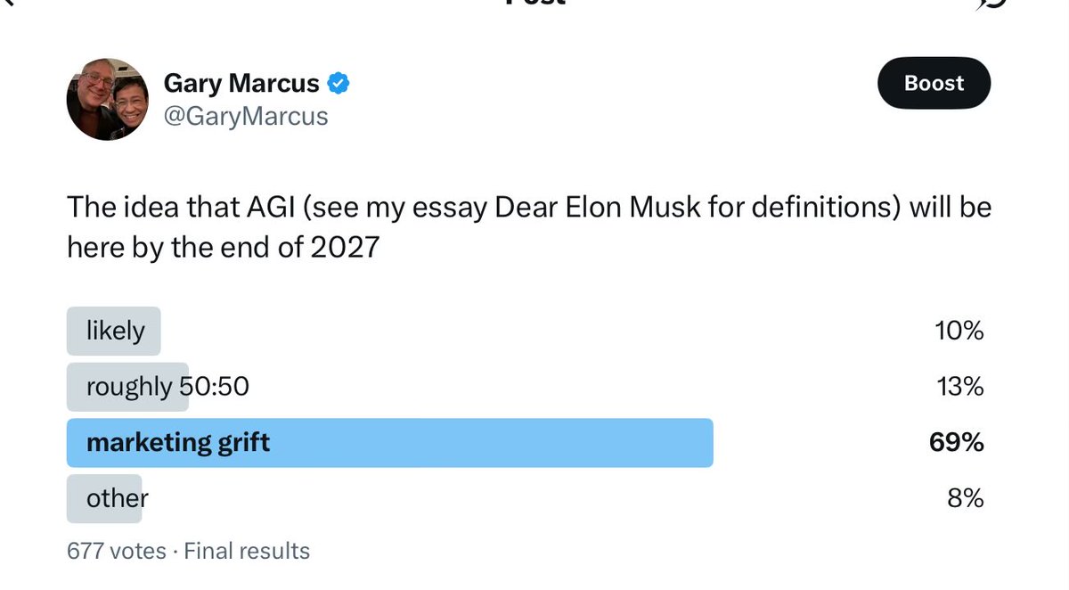 The statement and poll address the public issue of Artificial General Intelligence (AGI) and its potential arrival by 2027. It invites public opinion on a significant technological and societal topic, engaging in public discourse.