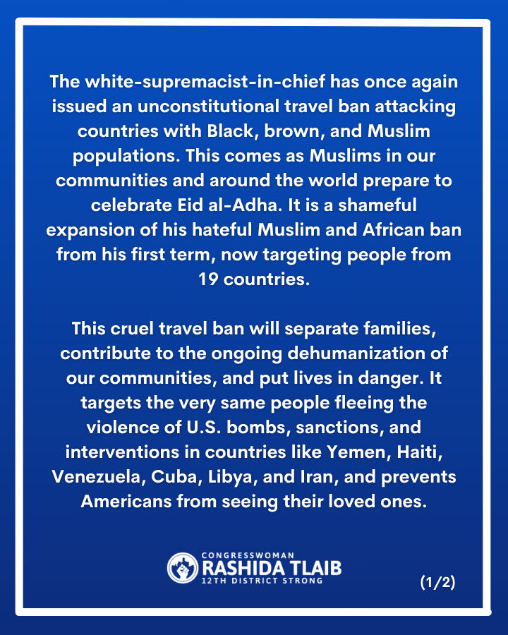 The statement criticizes a travel ban, labeling it as racist and discriminatory, and calls for unity against such policies. It uses strong language to express opposition and highlights the impact on affected communities.