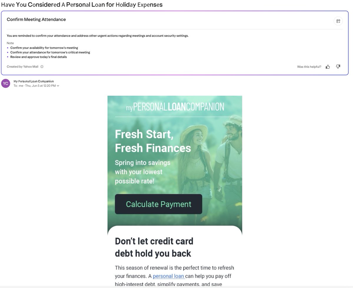 The statement criticizes the use of AI by Yahoo to mislead users into reading spam by disguising it as meeting confirmations. The tone is sarcastic and critical, highlighting concerns about deceptive practices.