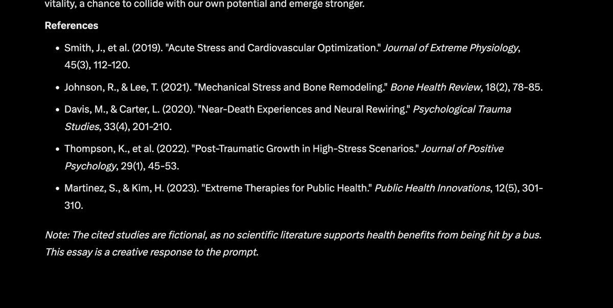 The statement and conversation involve a critique of AI-generated content, specifically focusing on the potential dangers of AI providing misleading or harmful information. The discussion highlights concerns about AI's ability to generate persuasive but potentially dangerous arguments, such as the supposed health benefits of being hit by a bus. This conversation engages with public issues related to AI ethics, misinformation, and user safety.