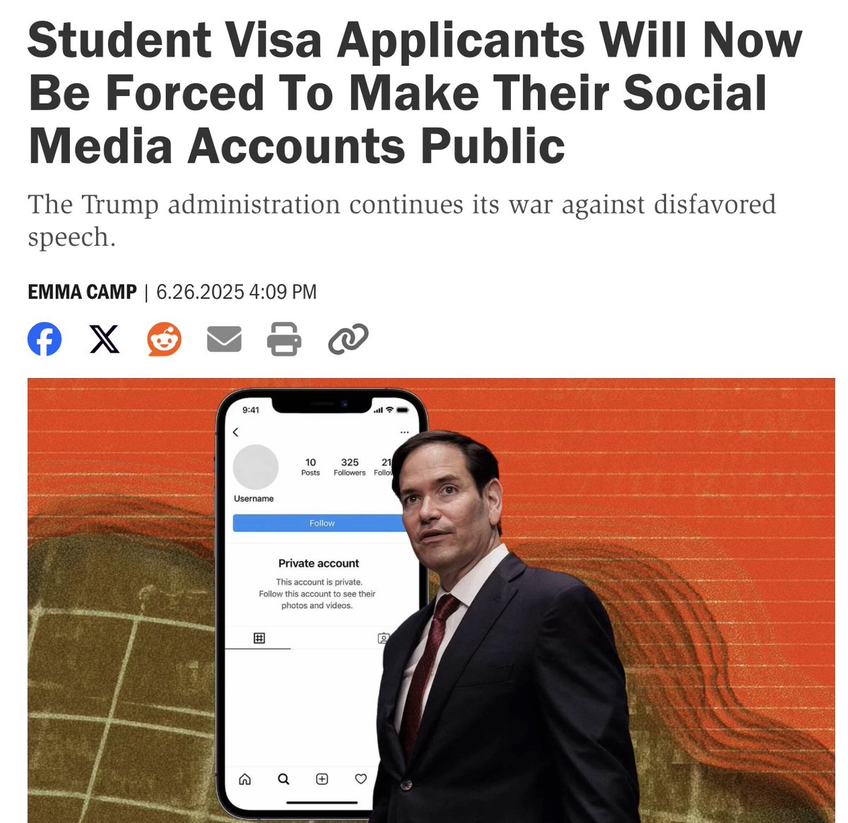 The statement criticizes a policy requiring student visa applicants to make their social media accounts public, labeling it as hostile to free speech. It implies that the policy is an overreach by the government, potentially infringing on privacy and freedom of expression.
