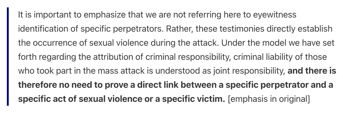 The statement critiques an Israeli report on sexual violence, suggesting it focuses on lowering evidentiary standards rather than presenting new evidence. The tone is critical, questioning the report's approach to evidence and legal standards.