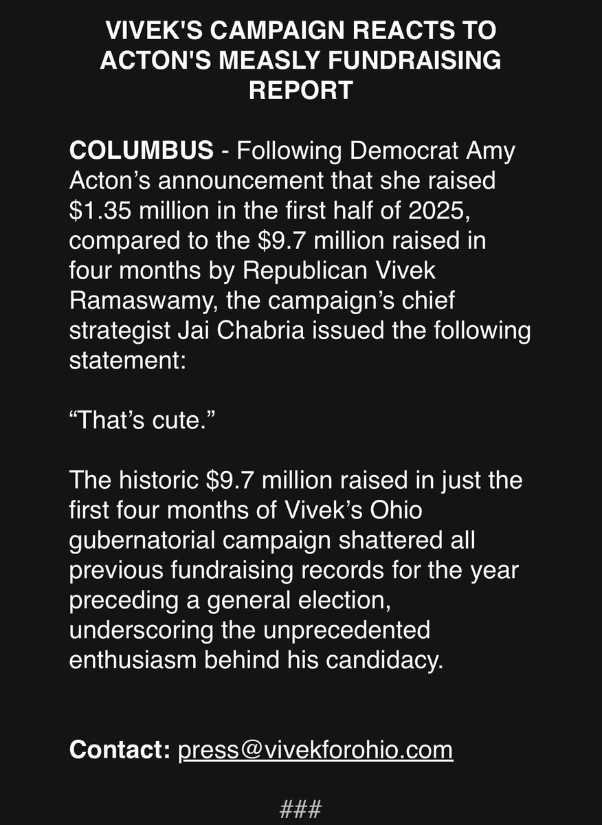 The statement from Vivek's campaign uses a dismissive tone ('That's cute') to belittle Amy Acton's fundraising efforts. This approach lacks respect and does not promote constructive dialogue. The focus is on comparing fundraising amounts rather than engaging with the issues or policies at stake.