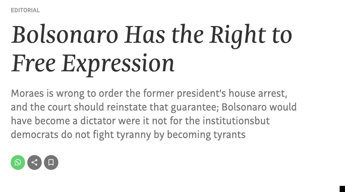 The statement and images engage in public discourse by discussing the balance between free speech and judicial actions in Brazil. The editorial argues against the arrest of a former president, emphasizing the importance of upholding constitutional rights and warning against authoritarian practices.