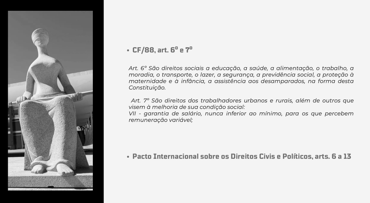 The statement discusses constitutional and international legal provisions related to social and economic rights, responding to concerns about violations of these rights. It references specific articles from the Brazilian Constitution and international treaties, emphasizing the importance of social rights such as education, health, and fair wages. This contributes to public discourse by addressing issues of legal and social justice.