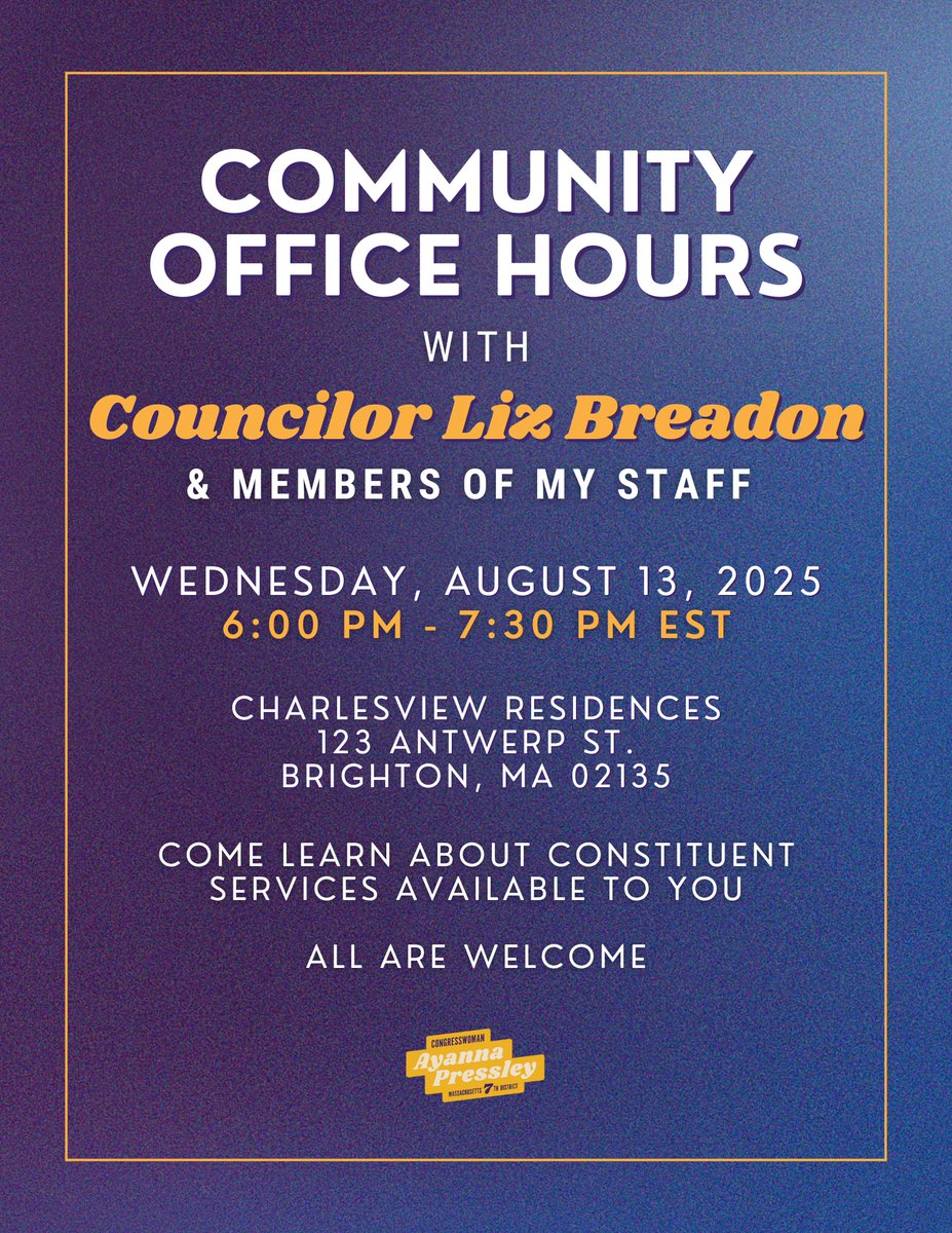 The statement is promotional, inviting community members to attend office hours to learn about constituent services. It does not engage in substantive public discourse or address public issues.