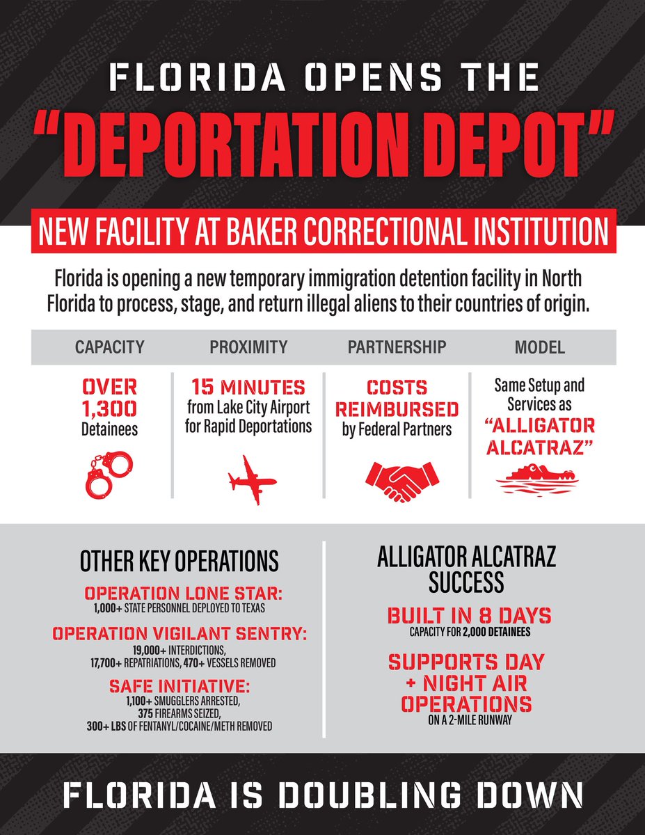 The statement and accompanying image discuss the opening of a new immigration detention facility in Florida, highlighting its capacity and coordination with federal authorities. The tone is assertive and promotional, emphasizing efficiency and success in immigration enforcement.